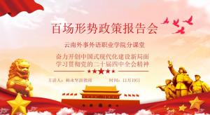 11月19日,云南外事外语职业学院在报告厅举办2025年百场形势政策报告会,深入学习贯彻党的二十届四中全会精神。本次活动特邀云南中医