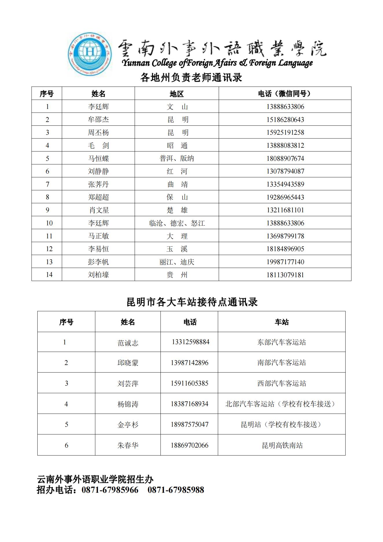 4.新生报到期间我校在昆明各大车站设有接待点,新生出发前可与我校招生办联系,到昆明后我校新生接待人员将统一安排车辆接送学生到学院(联系电话:0871-67985966、67985988)