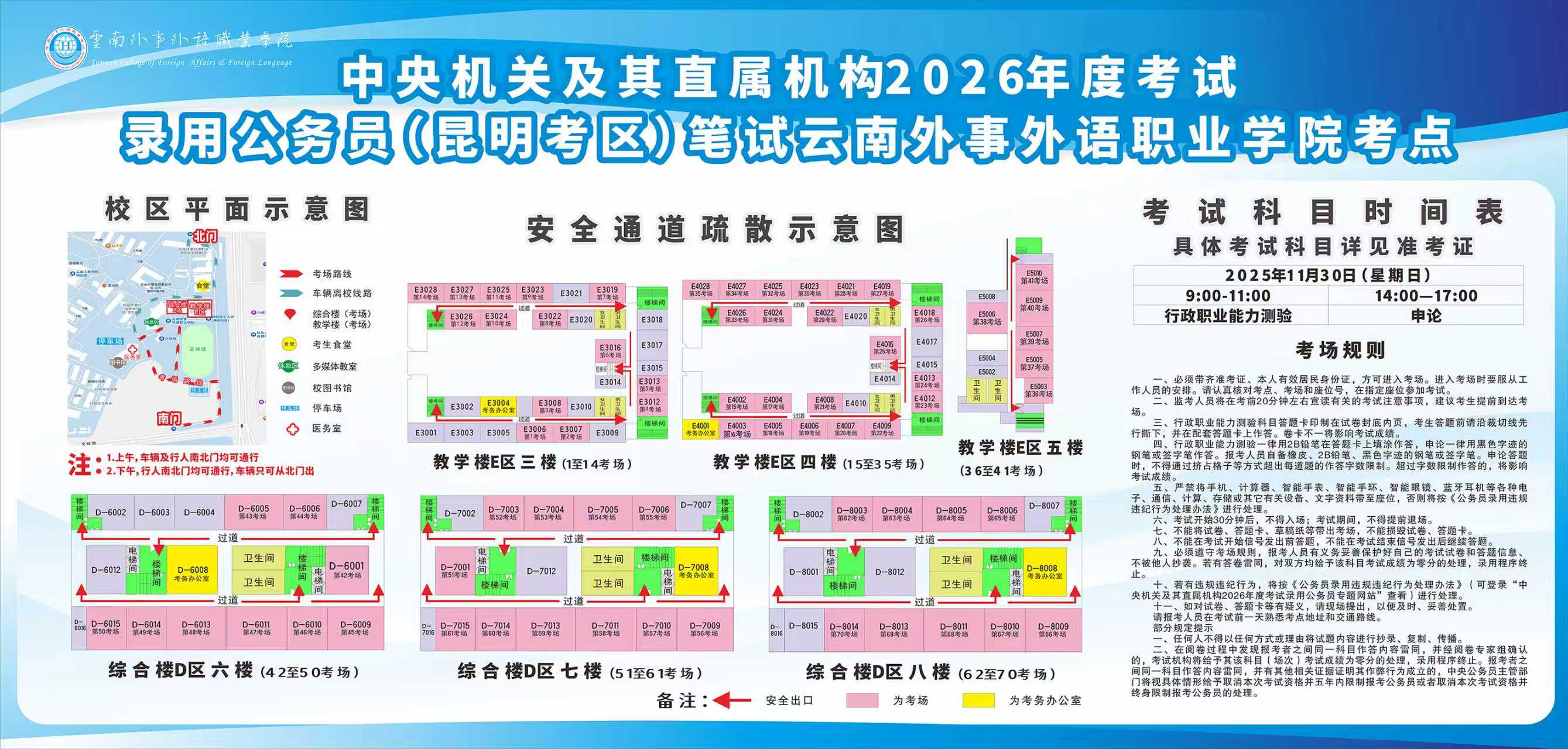 中央机关及其直属机构2026年度考试录用公务员笔试(云南外事外语职业学院考点)将于11月30日举行,云南外事外语职业学院为此次考试的考点之一。为确保各位考生顺利参加考试,现将相关注意事项提示如下,希望能为各位考生提供便利,预祝各位考试一切顺利。