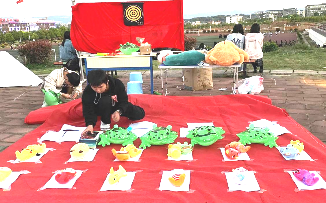 工程学院2020级建筑室内设计2班马翔同学的套圈娱乐游戏生意是最火爆的。只要付一点点money,你就可以得到多个彩色的圈圈,套走你想要的小礼品。