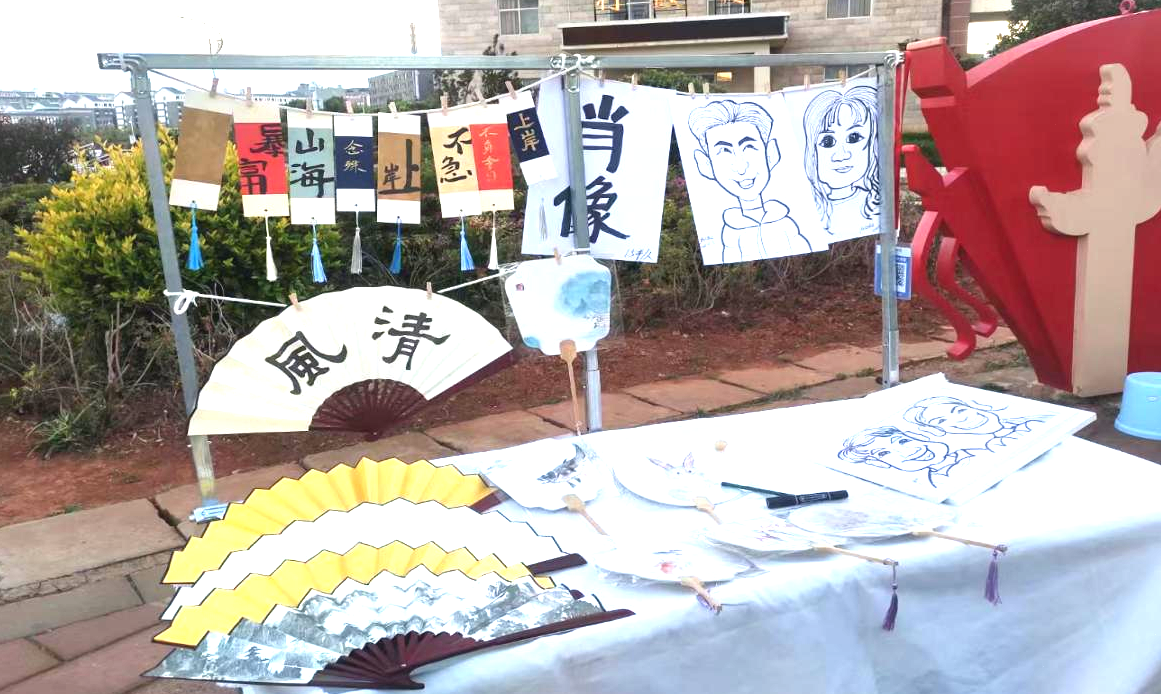 教育学院2019级学前教育5班解紫艺利用自己所学专业知识发挥想象,把创作的书法作品、书签、折扇等手工作品进行售卖。她说想用自己学到的专业技能制作作品来摆摊创业,让大家在校园里体验到美术与手工结合的快乐。