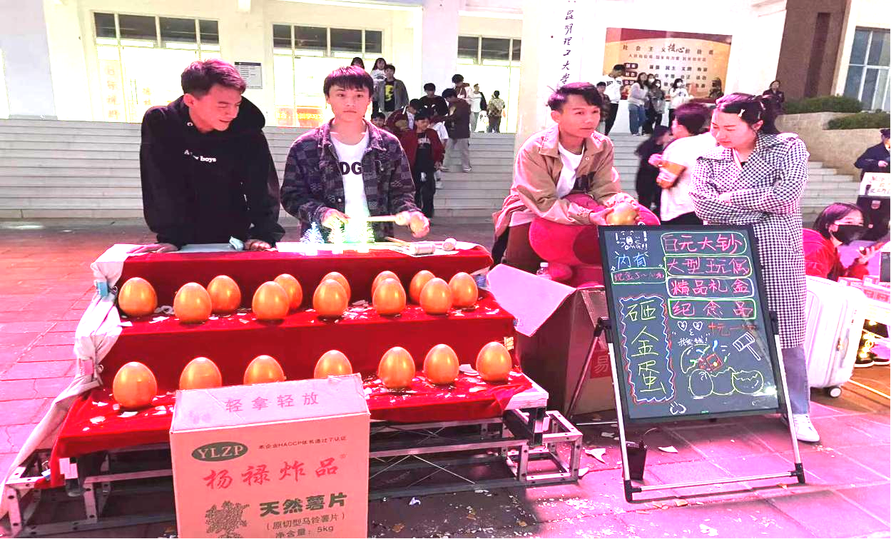基础教育学院2021级建筑工程管理高飞同学给大家带来砸“金蛋”游戏。“金蛋”里面有各种百元大钞、精美礼盒、大型玩偶值得大家来挑战自己的运气,把心意的礼品带回家,是具有挑战性的一项娱乐活动。