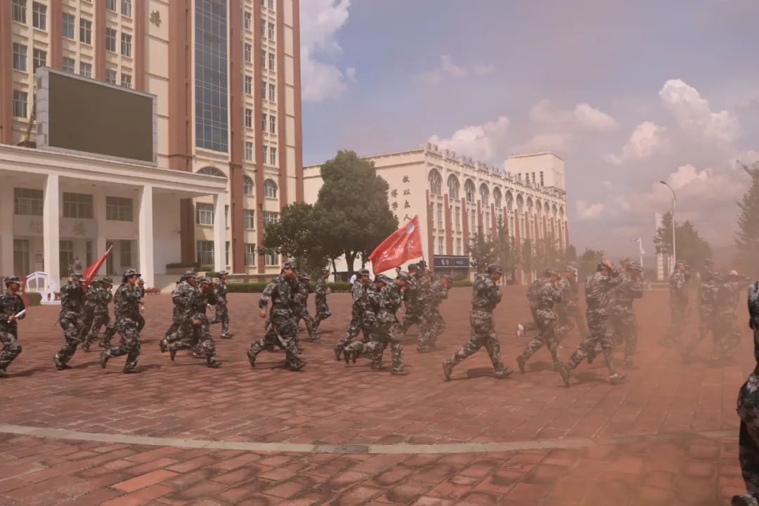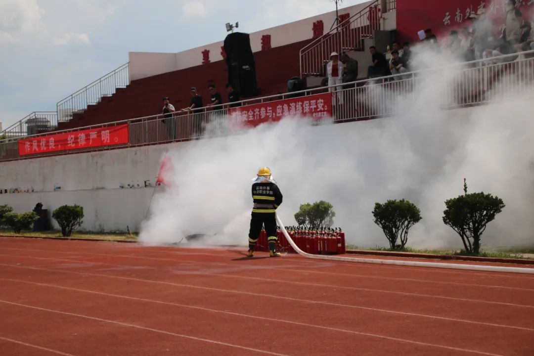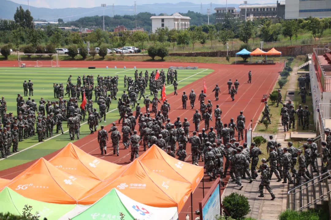 本次演练模拟多媒体教学楼区域突发火灾的场景。随着警报声响起,新生们在辅导员和教官的指挥下,用衣服捂住口鼻,低姿快速、有序地疏散至指定足球场安全区域。