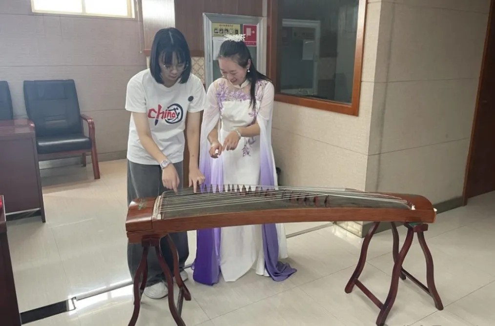 仪式现场还开展了中国传统文化表演与体验活动,教育学院学生带来古筝演奏、舞蹈《星月神话》,空灵鼓和葫芦丝演奏赢得泰国师生阵阵掌声。泰国学生在角春娟老师的耐心指导下,饶有兴致地尝试弹奏古筝、敲击空灵鼓,尽管手法生疏,但兴致盎然,现场欢声笑语不断,文化互鉴的魅力在互动中悄然绽放。