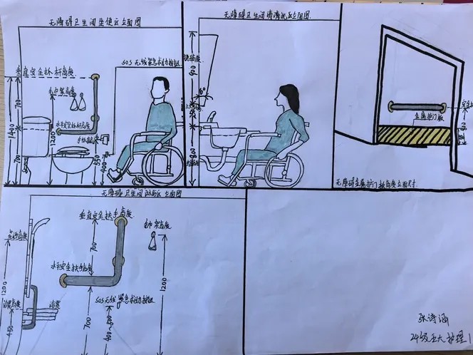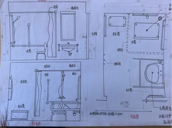 参赛作品构思细致、细节到位,体现出护理专业知识与设计创意的融合。学生结合老年人身体机能特点,融入多样适老设计:合理规划空间,预留充足的无障碍通道和转身区域;采用防滑地面与圆角家具,降低意外磕碰可能性;部分作品加入多功能扶手、智能感应洁具、紧急呼叫系统等设施,兼顾实用与便捷。这些设计图纸承载着学生对老年照护的理解与关怀,也反映出他们扎实的专业基础和一定的创新能力。