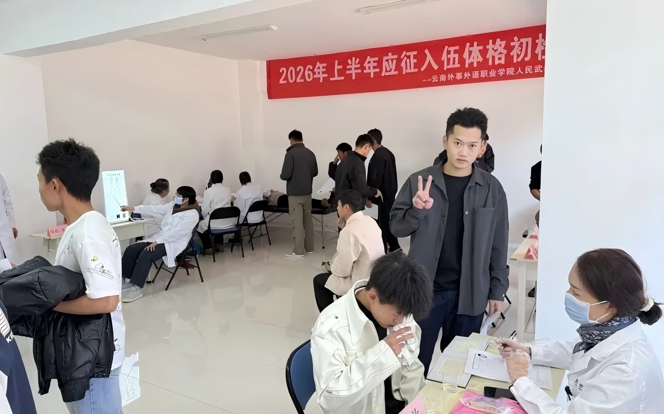 12月26日,云南外事外语职业学院2026年上半年征兵初检初审工作在学生中心落幕。此次初检由学校人民武装部统筹、昆明普瑞眼科医院医务室执行,36名报名应征同学全员参与。