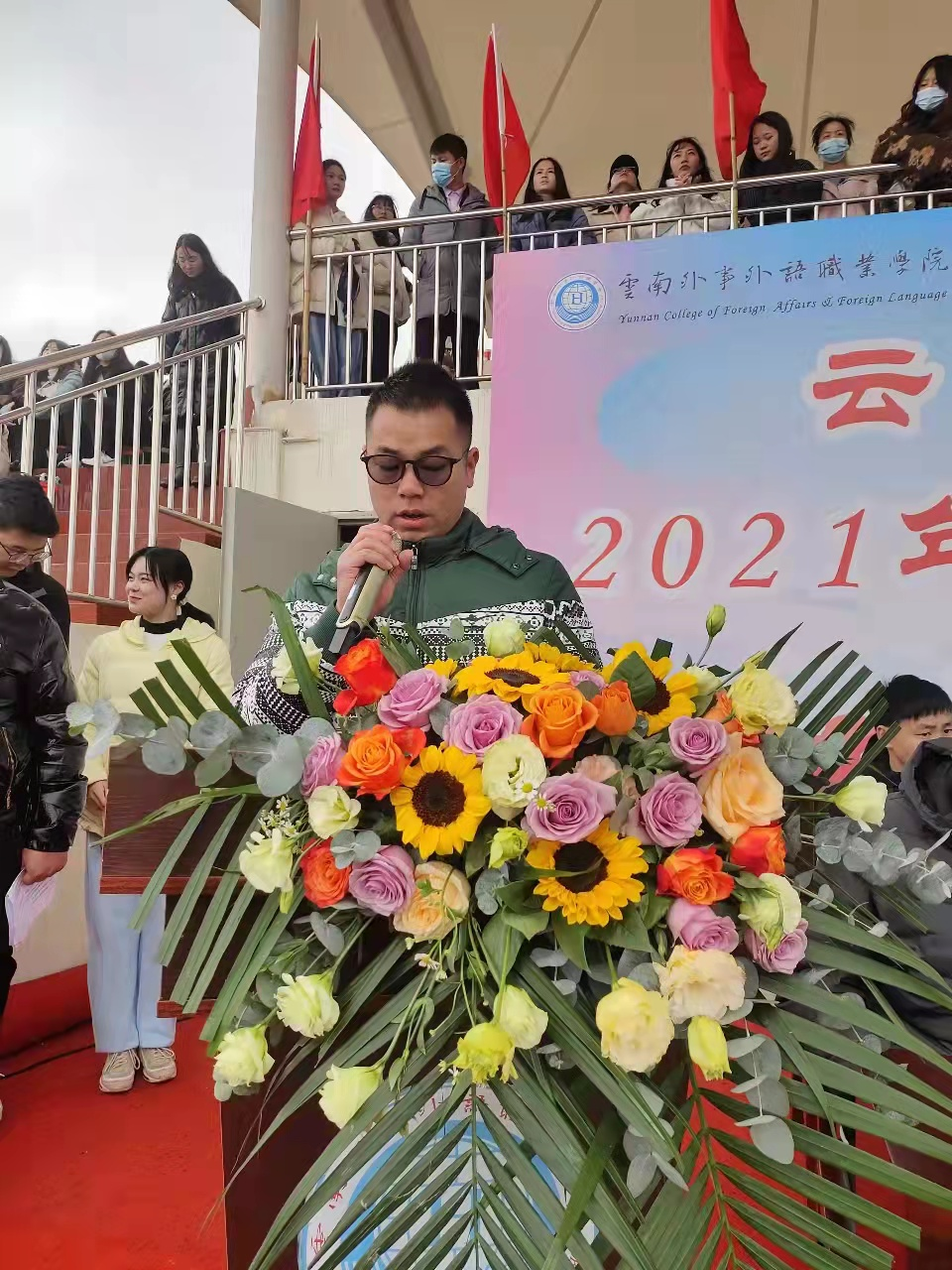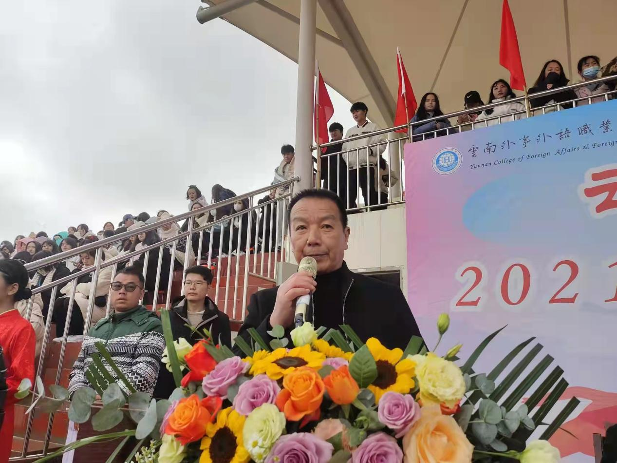 党委副书记、副校长邓超宣布云南外事外语职业学院第八届冬季田径运动会开幕,10组彩烟炫目绽放亦象征云南外事外语职业学院建校10年风雨兼程,初心不忘。