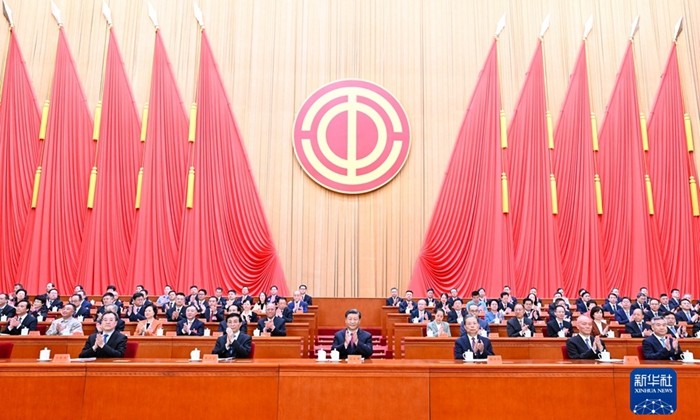 人民大会堂大礼堂气氛热烈。主席台上方悬挂着“中国工会第十八次全国代表大会”的会标,后幕正中象征着中国工会和中国工人阶级团结统一的工会会徽熠熠生辉,10面红旗分列两侧。二楼眺台悬挂着“坚持以习近平新时代中国特色社会主义思想为指导,全面贯彻党的二十大精神,组织动员亿万职工为全面建设社会主义现代化国家、全面推进中华民族伟大复兴团结奋斗!”的巨型横幅。