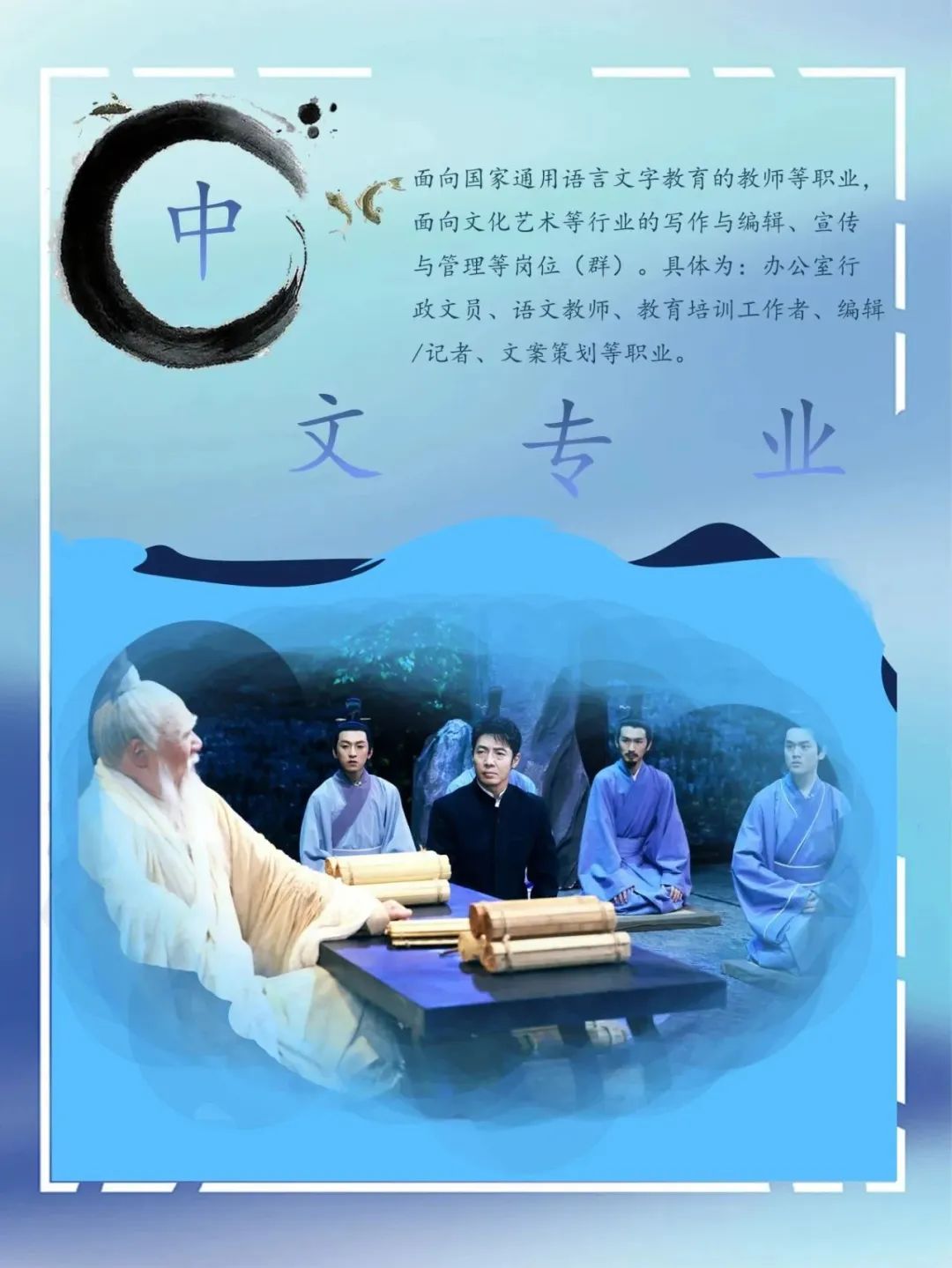 面向国家通用语言文字教育的职业,面向文化艺术等行业的写作与编辑、宣传与管理等岗位(群)。具体为:办公室行政文员、语文教师、教育培训工作者、编辑/记者、文案策划等职业。